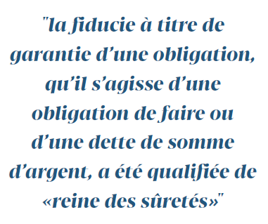 C’est à juste titre que, dès son apparition dans l’espace juridique français, la fiducie à titre de garantie d’une obligation, qu’il s’agisse d’une obligation de faire ou d’une dette de somme d’argent, a été qualifiée de « reine des sûretés » (des sûretés réelles, s’entend).
